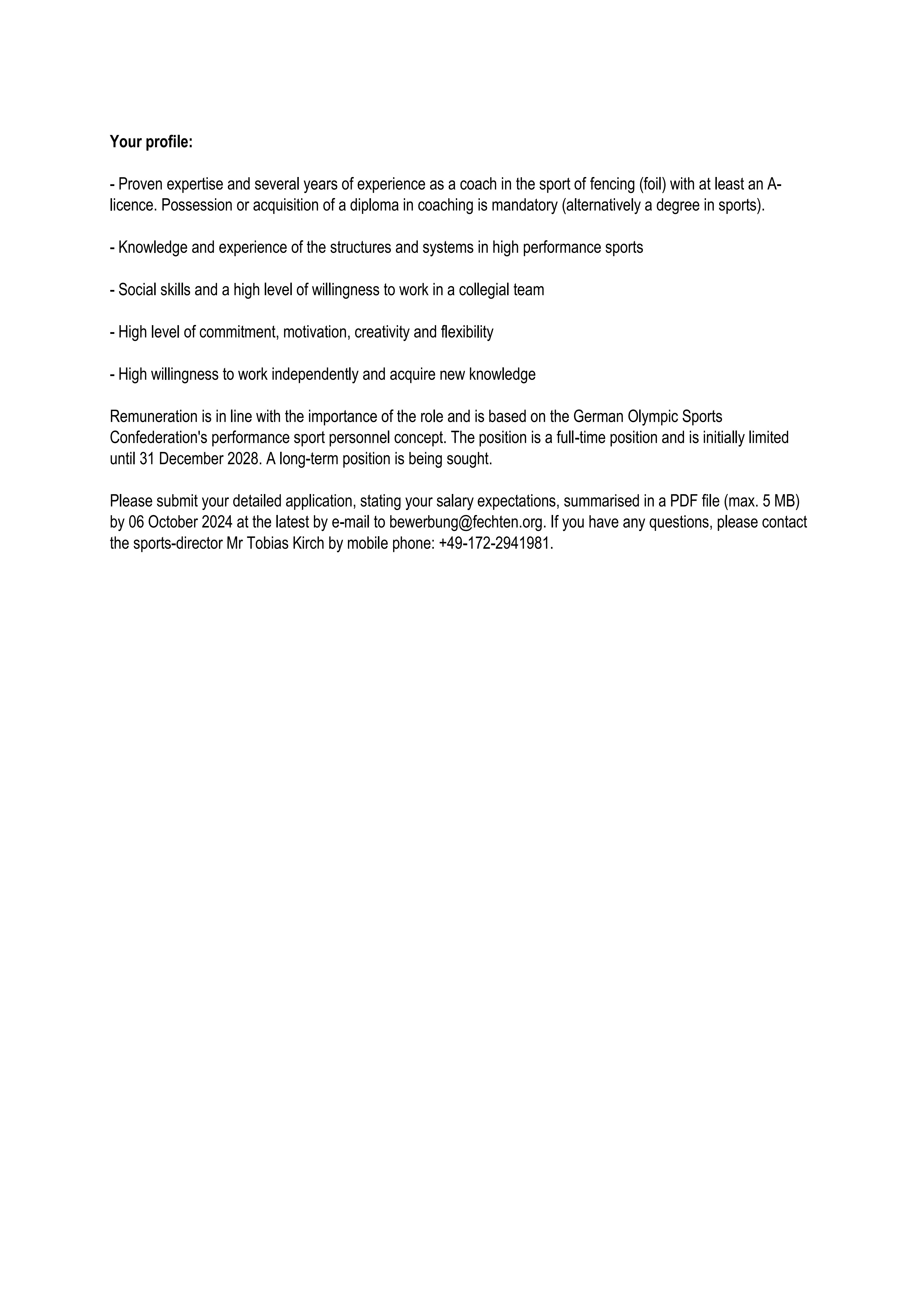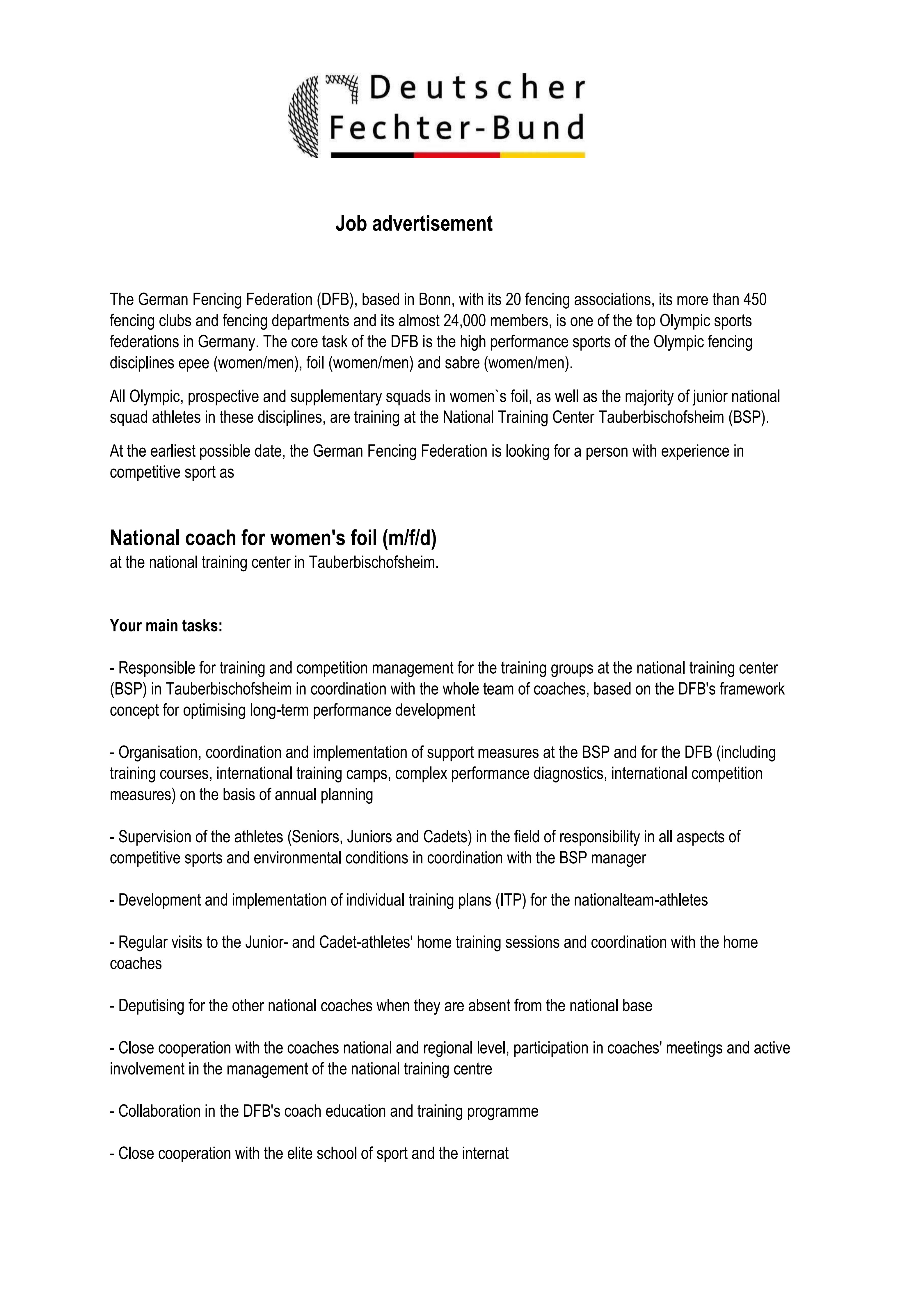 Jobs: National Coach for Women's Foil, German Fencing Federation